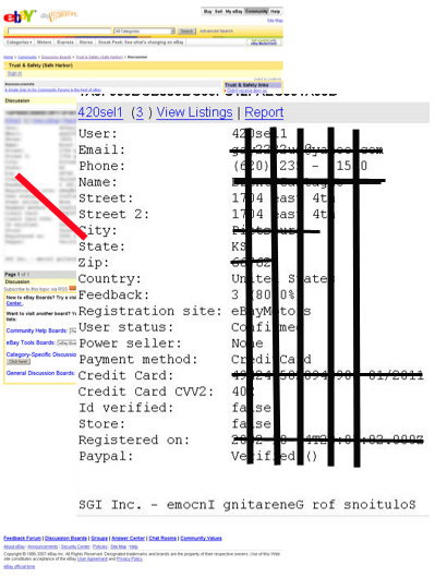 On Tuesday 25 Sep 2007 at 5:42 AM ebaY time, a hacker posted 29 to 50 pages of ebaY user information on the ebaY Trust and Safety discussion board (at approx 40 threads per page that is between 1100 and 2000 user IDs). The information was posted by using the user ID and account of the user whose information was posted, and included the ebaY user ID, email address, phone, name, street, city, state, zip, country, feedback info, what site they registered on, user status, powerseller status, payment method they used to pay ebaY, credit card number (with expiration date), credit card CVV2 code (the three digit security code on the back of the card), whether they are id verified, if they have an ebaY store and which site that is registered on, and if they are PayPal verified or not verified. The threads that contained the info also had a signature at the bottom of the post - SGI Inc. - emocnI gnitareneG rof snoituloS (Solutions for Generating Income spelled backwards) SGI Inc. is the company name used by Vladuz, a hacker who has demonstrated that he has the ability to access ebaY databases.